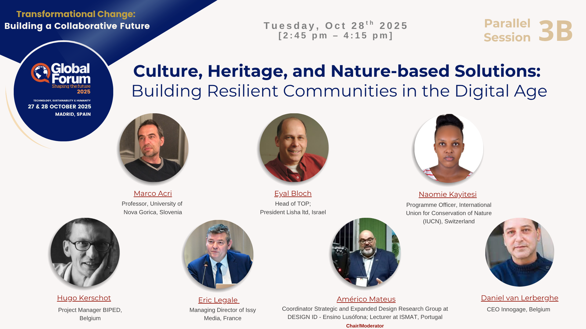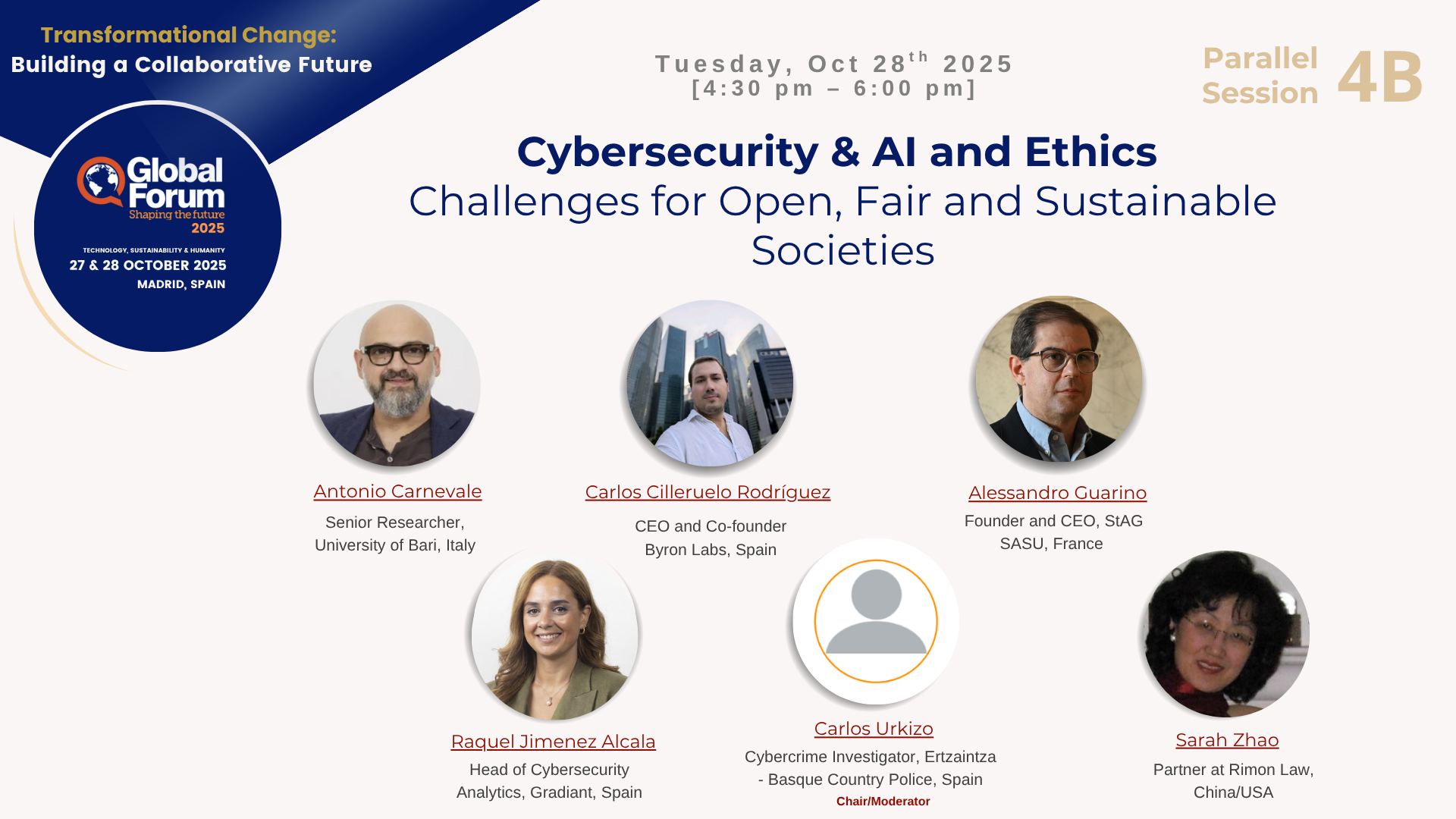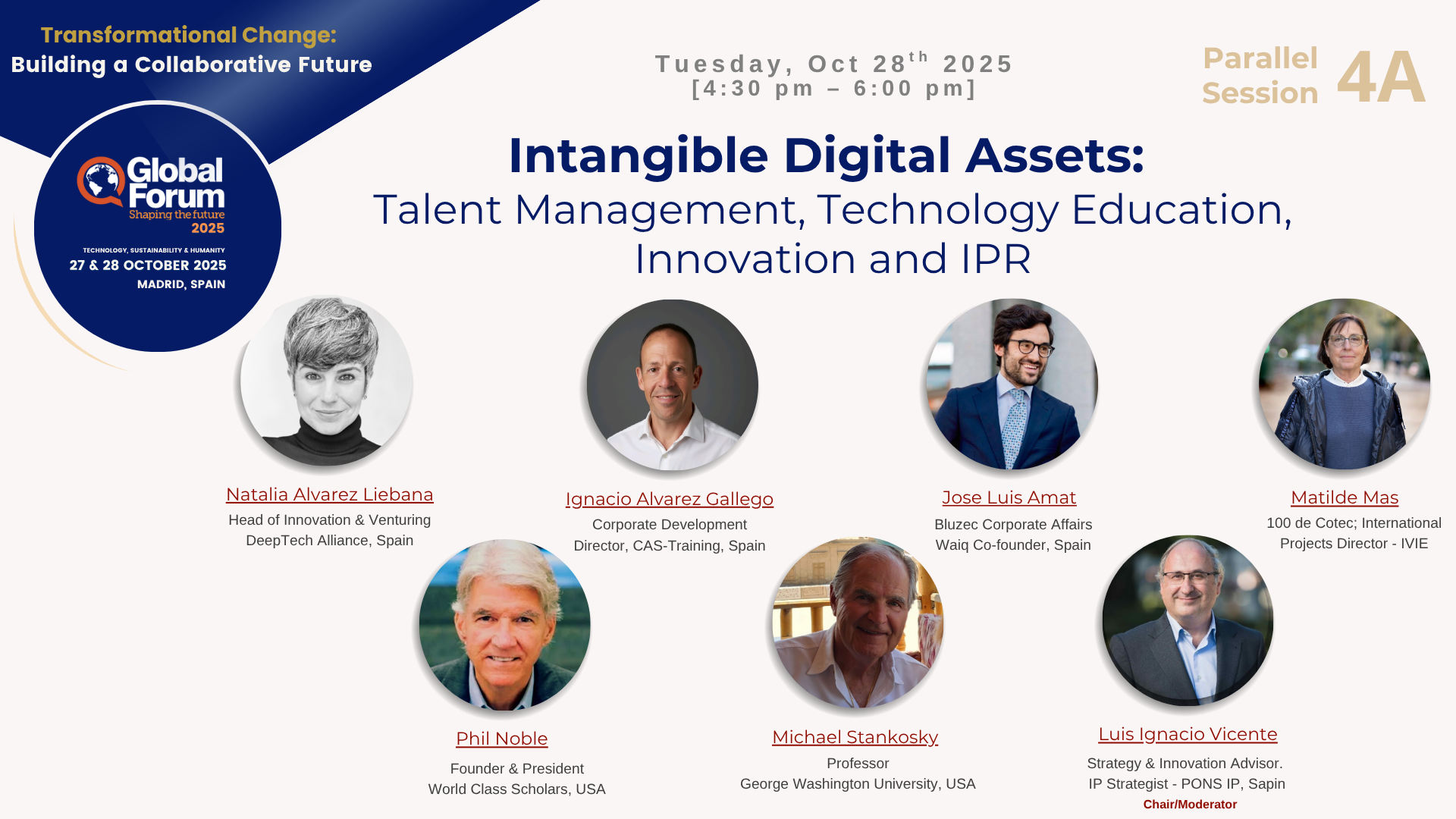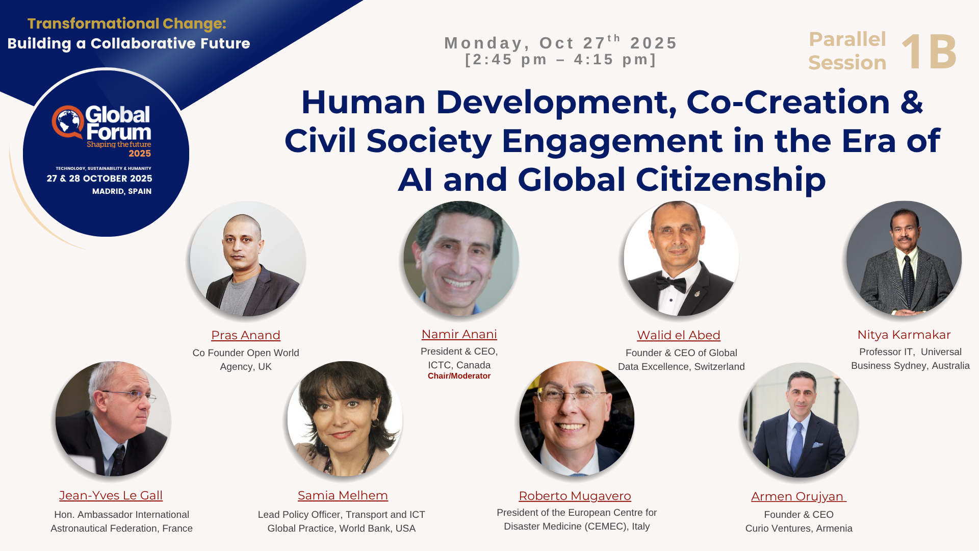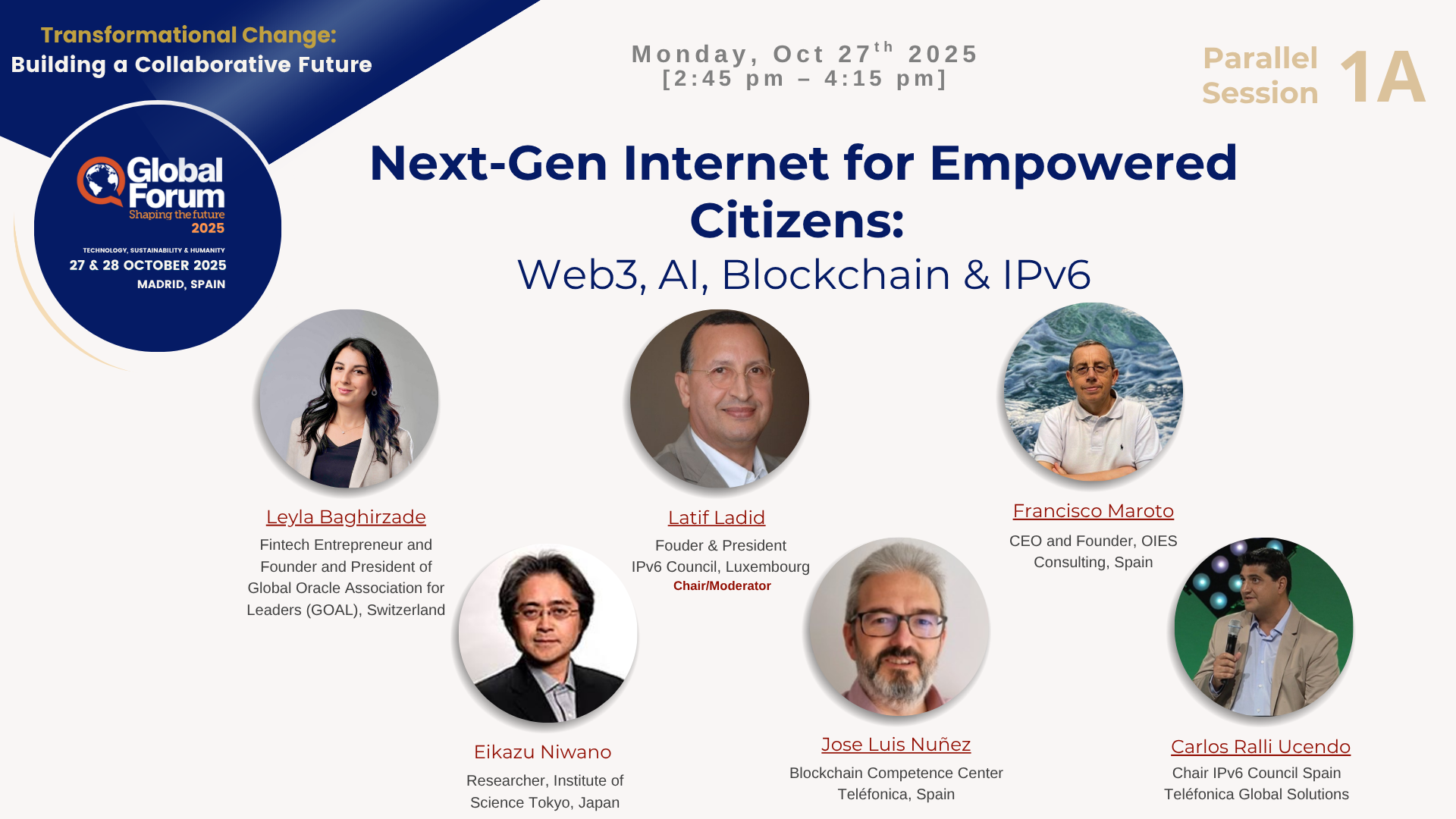 Marco Acri, Professor, University of Nova Gorica, Slovenia • Sylvie Albert, Professor and Former Dean, Faculty of Business and Economics, University of Winnipeg, Canada • Fernando Alvarez, Subdirector de Transformación Digital. D.G. Oficina Digital en Ayuntamiento de Madrid, Spain • Ignacio Alvarez Gallego, Corporate Development Director, CAS-Training, Spain • José Luis Amat, Bluzec Corporate Affairs; Waiq Co-founder, Quantum Investment Fund, Spain • Pras Anand, Co Founder Open World Agency, UK • Namir Anani, President & CEO at Information and Communications Technology Council – ICTC, Canada • Thomas Andersson, President IKED, Sweden; President Water & Humanity, Oman • Jean-Eric Aubert, President of Foundation 2100, France • Leyla Baghirzade, Fintech Entrepreneur; Board Member at Blockchain Azerbaijan, Switzerland • Franz Bergmeier, Development of green energy & hydrogen ecosystems, Germany • Alfonso Martos Berlanga, Ministry of Transport and Sustainable Mobility, Spain • Katherine D. Blizinsky, Neuroscientist & Science Policy Professional, USA • Eyal Bloch, Head of TOP and President of Lisha ltd • José María Bolufer, ESG Customer & Sustainable Innovation, Telefónica, Spain • Stuart N. Brotman, Professor School of Journalism & Media University of Tennessee, USA • Shaila Calvo Almeida, Head of eHealth & Biotech, Gradiant, Spain • Juan Cambeiro, 5G Customer Innovation, Telefónica, Spain • Mário Campolargo, Invited Professor at University of Aveiro; Former Secretary of State for Digitalisation and Administrative Modernisation of the Portuguese Government, Portugal • Victor Canivell, Co-founder & Chairman, Qilimanjaro Quantum Tech, Spain • Marcel Cardinali, Head of Sustainable Urbanism Research at TH OWL & Strategy Development at City of Detmold, Germany • Antonio Carnevale, Assistant Professor at the University of Bari, Italy • Carlos Cilleruelo Rodríguez, CEO and Co founder Byron Labs, Spain • Mariane Cimino, Co-Founder Cimbiose, France • Fernando de la Iglesia, Vice President Product, Quside, Spain • Astrid de Meijer, Co-founder of Beyond the Dots, The Netherlands • Oscar Diez, Deputy Head of Unit for Quantum Technologies, European Commission • Giuliano Di Vitantonio, CEO Teranode Group, Switzerland • Alain Ducass, Catalyst for Change & President of Al-Amiable and AEMA Mediation, France • Walid El Abed, Founder & CEO, Global Data Excellence, Switzerland • Ricardo Enríquez Miranda, Head of Quantum Advisory Team, Repsol, Spain • Guido Ferilli, Professor, IULM, Milan, Italy • Sébastien Grappe, PhD Student at ENS Lyon, INRIA, France • Stéphane Grumbach, Senior Scientist at INRIA, France • Alessandro Guarino, Founder of CEO StAG SASU, Cybersecurity and Data Protection Advisor, France • Juanjo Hierro, CTO FIWARE Foundation; Chairman FIWARE Technical Steering Committee, Spain • Antonio Jara, CSO / Executive Board Member Libelium, Spain • Raquel Jimenez Alcala, Head of Cybersecurity Analytics, Gradiant, Spain • Nitya Karmakar, Professor IT, Universal Business Sydney, Australia • Naomie Kayitesi, Programme Officer at IUCN’s Nature-based Solutions (NbS) Management Hub, Switzerland • Hugo Kerschot, Project Manager BIPED, Belgium • Latif Ladid, Founder & President, IPv6 Forum, Luxembourg • José Miguel Lameiras, Assistant Professor, BIOPOLIS/CIBIO, University of Portugal • Eric Legale, Managing Director of Issy Media, France • Jean-Yves Le Gall, Honorary Ambassador International Astronautical Federation, France • Diego R. Lopez, Senior Technology Expert, Telefónica, Spain • Miguel Lopez Valverde, Regional Minister for Digitalization of the Community of Madrid, Spain • Francisco Maroto, CEO and Founder OIES Consulting, Spain • Vicente Martin, Professor, Madrid Quantum Network – Universidad Politécnica de Madrid, Spain • Américo Mateus, Lecturer at ISMAT – Portimão, Portugal. Researcher at CIAUD – Pólo COFAC, Coordinator of the Strategic and Expanded Biodesign Research Group at DESIGN ID, Portugal • Samia M. Melhem, Lead Policy Specialist on Digital Development, The World Bank • Roberto Mugavero, President of the European Centre for Disaster Medicine (CEMEC), Italy • Michael P. Nash, Filmmaker, Founder of Beverly Hills Productions, USA • Eikazu Niwano, Researcher at the Institute of Science Tokyo, Japan • Phil Noble, Founder & President, World Class Scholars, USA • Jose Luis Nuñez, Blockchain Competence Center Telefónica, Spain • Dolores Ordoñez, General Director AnySolution, EU Agri Dataspaces, Spain • Armen Orujyan, Founder and CEO, Curio Ventures, USA • Griffin Peddicord, Strategic Adviser Xange.com, UK • Pascal Poitevin, Senior Consultant at ITG Groupe, France • Carlos Ralli-Ucendo, Head of IPv6 Council Spain • Ventura Sarasa, Quantum Scientist Associate – BBVA, Spain • Christian Schmitz, Founder PDIE – Purpose Driven Innovation, Japan • Jorge Serrano Leal, Technical Director CREA Madrid Nuevo Norte, Spain • Manuel Sierra Castañer, Director ETSIT UPM, Spain • Michael Stankosky, Professor, Author, Scholar, Lecturer, and Editor-Emeritus, George Washington University, USA • José Luis Tallon, Global Forum 2025 Local Host, CEO & Co-funder We Are Technology – WAT, Spain • Rocío Torres, Head of Sustainability & Responsible Business, Atletico de Madrid, Spain • Daniel van Lerberghe, CEO at Innogage, Belgium • Alejandro Ugarrio Andrés, Director of Atleti Lab – Atletico de Madrid, Spain • Luis Ignacio Vicente, Strategy Advisor, PONS IP, Spain • Victor Villagrá, Subdirector ETSIT UPM, Spain • Sarah Zhao, Partner at Rimon Law, USA/ China